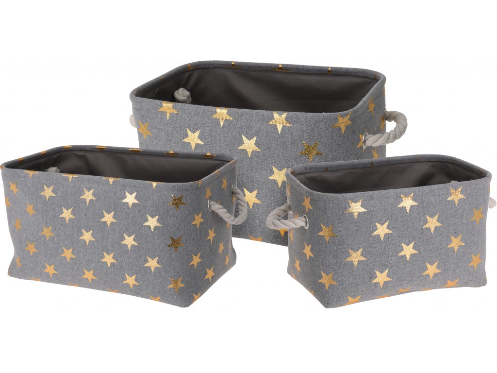 Souprava 3 ks pevných úložných boxů z šedé látky s motivem zlatých hvězdiček. Lze naskládat jeden do druhého. Ideální na hračky nebo drobnosti do dětského pokoje.