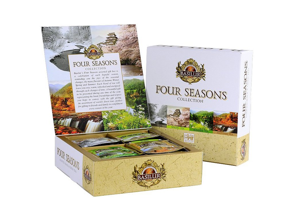 Složení: Winter Tea (složení: černý čaj, brusinkové aroma), Spring Tea (složení: zelený čaj, třešňové aroma), Summer Tea (složení: zelený čaj, aroma lesní jahody), Autumn Tea (složení: černý čaj, aroma javorového sirupu)