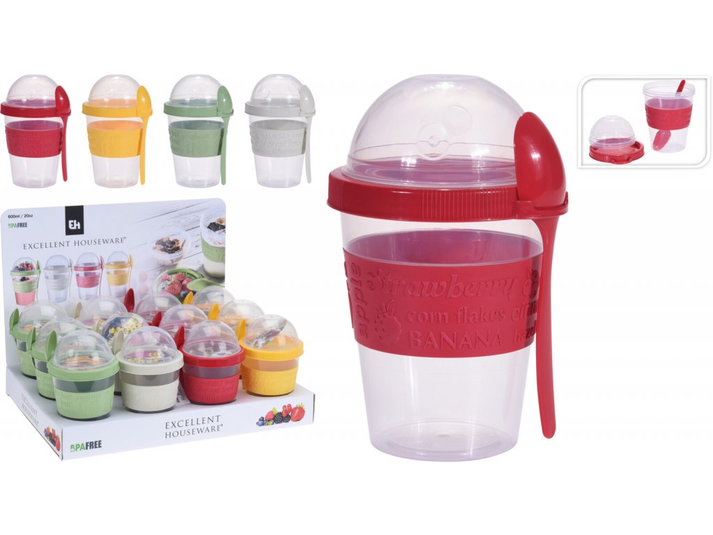 Kelímek je navržen pro maximální pohodlí. Spodní nádoba o objemu 450 ml je perfektní pro jogurt, smoothie nebo jiný mléčný nápoj. Do horního, samostatného víčka s objemem 150 ml se vejde ideální porce müsli, semínek, oříšků nebo čerstvého ovoce. Navíc má tento šikovný kelímek integrovaný držák, do kterého se vejde přiložená lžička, takže ji nebudete muset nikde hledat.