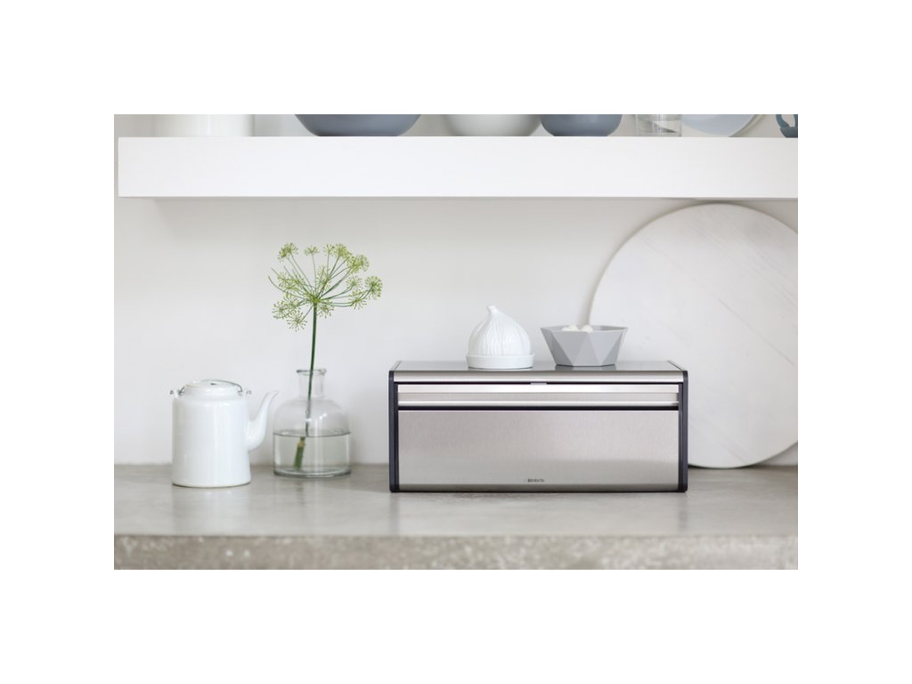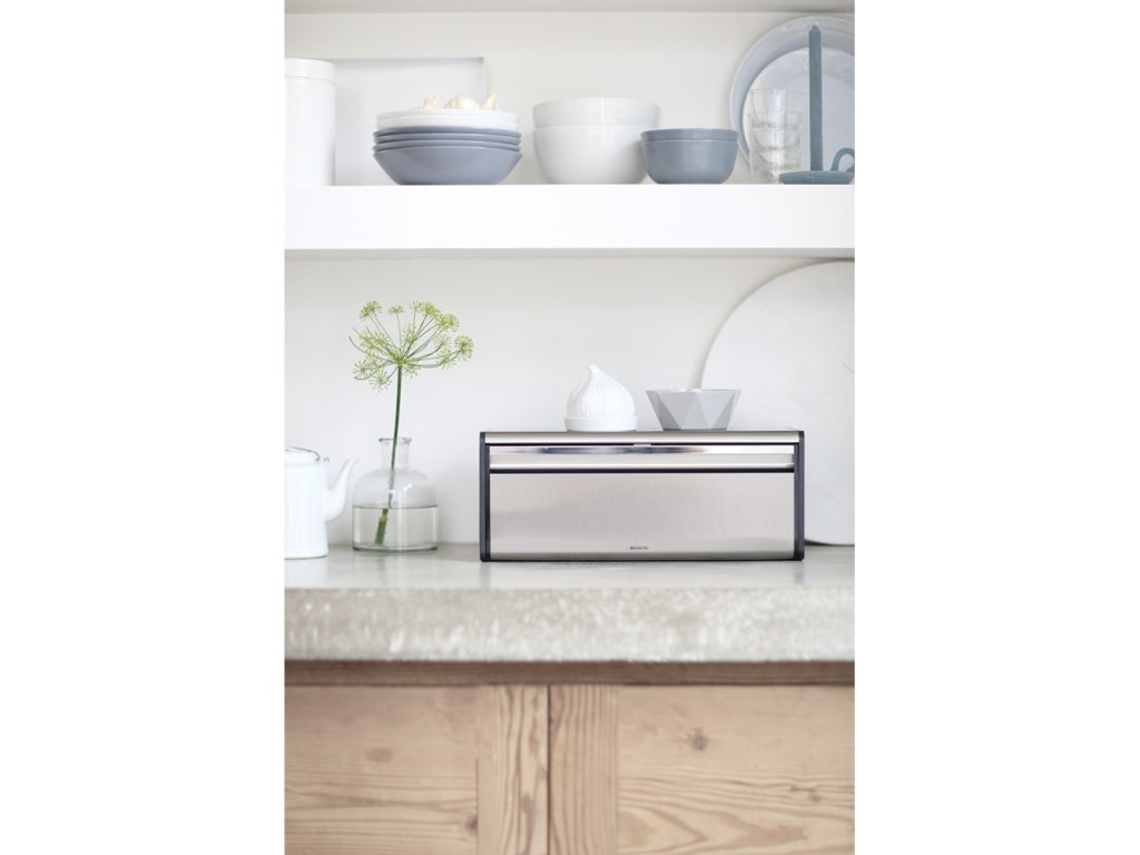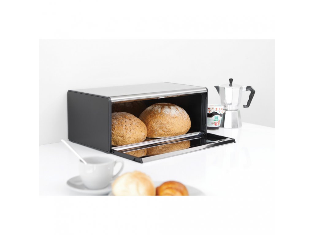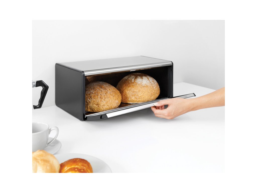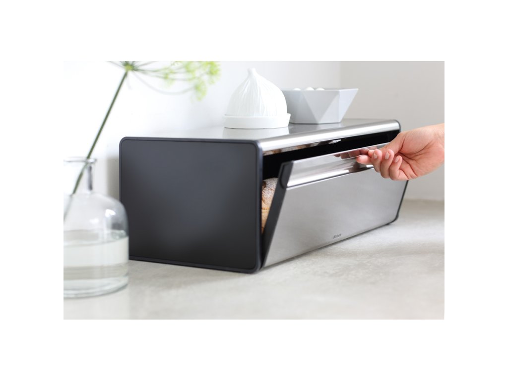 Chlebník v matné nerez barvě s patentovanou povrchovou úpravou FPP s minimalistickým hranatým designem a propracovanými detaily, je již několik let evergreenem mezi chlebníky na celém světě. Ideální velikost hravě pojme i český bochník chleba, bagetu, rohlík nebo sladké koláče.
