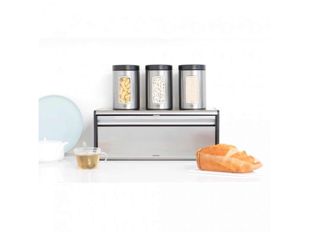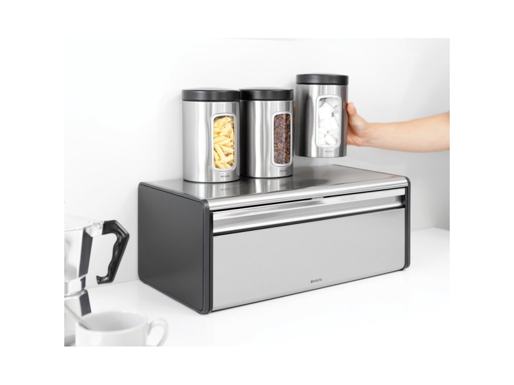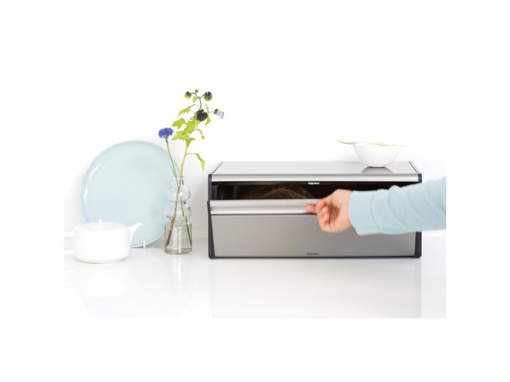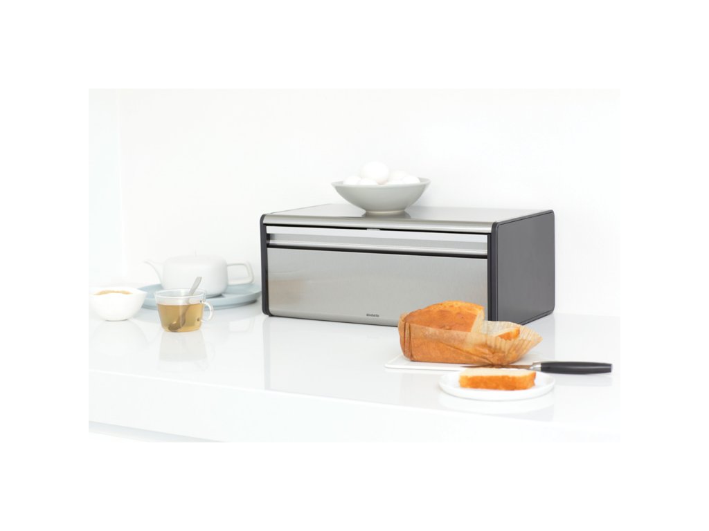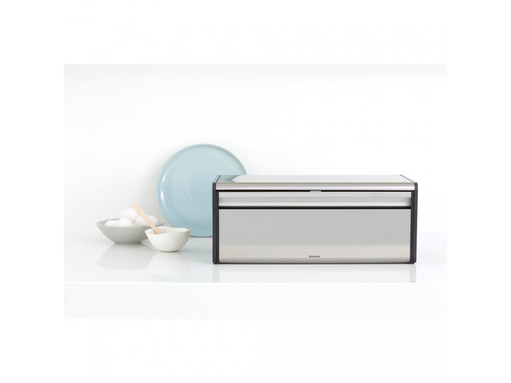 Chlebník v matné nerez barvě s patentovanou povrchovou úpravou FPP s minimalistickým hranatým designem a propracovanými detaily, je již několik let evergreenem mezi chlebníky na celém světě. Ideální velikost hravě pojme i český bochník chleba, bagetu, rohlík nebo sladké koláče.