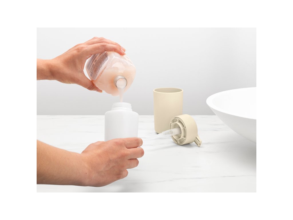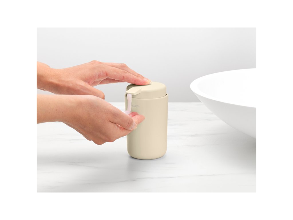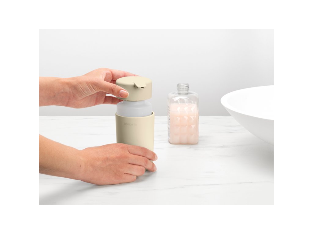 Seznamte se s dávkovačem mýdla Brabantia ReNew - stylovým koupelnovým doplňkem pro každého, kdo to s hygienou rukou a designem myslí vážně. Tento malý krasavec nejenže dávkuje mýdlo - ono z něj ani nekape a díky velkému otvoru pro doplňování a protiskluzové základně z něj vyzařuje kvalita. Design pro ruce!