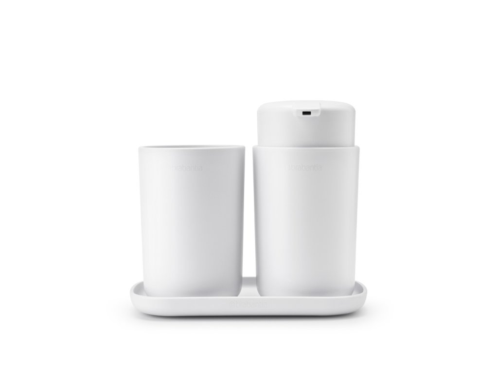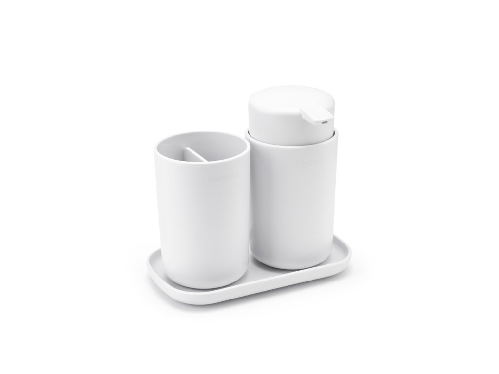 ReNew umyvadlová sada, 3ks - Dávkovač na mýdlo, držák na zubní kartáček a miska v jemné béžové barvě. Hygienický a praktický design, odolný proti korozi, snadno plnitelný a...