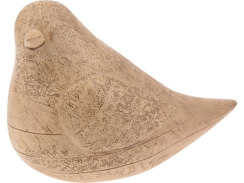 Tento dekorativní ptáček imituje povrch světlého dřeva, přesto je vyroben z odolného polyresinu. Spojuje vzhled přírodního materiálu s praktickými výhodami moderního zpracování – je lehký, pevný a odolný proti poškození.
