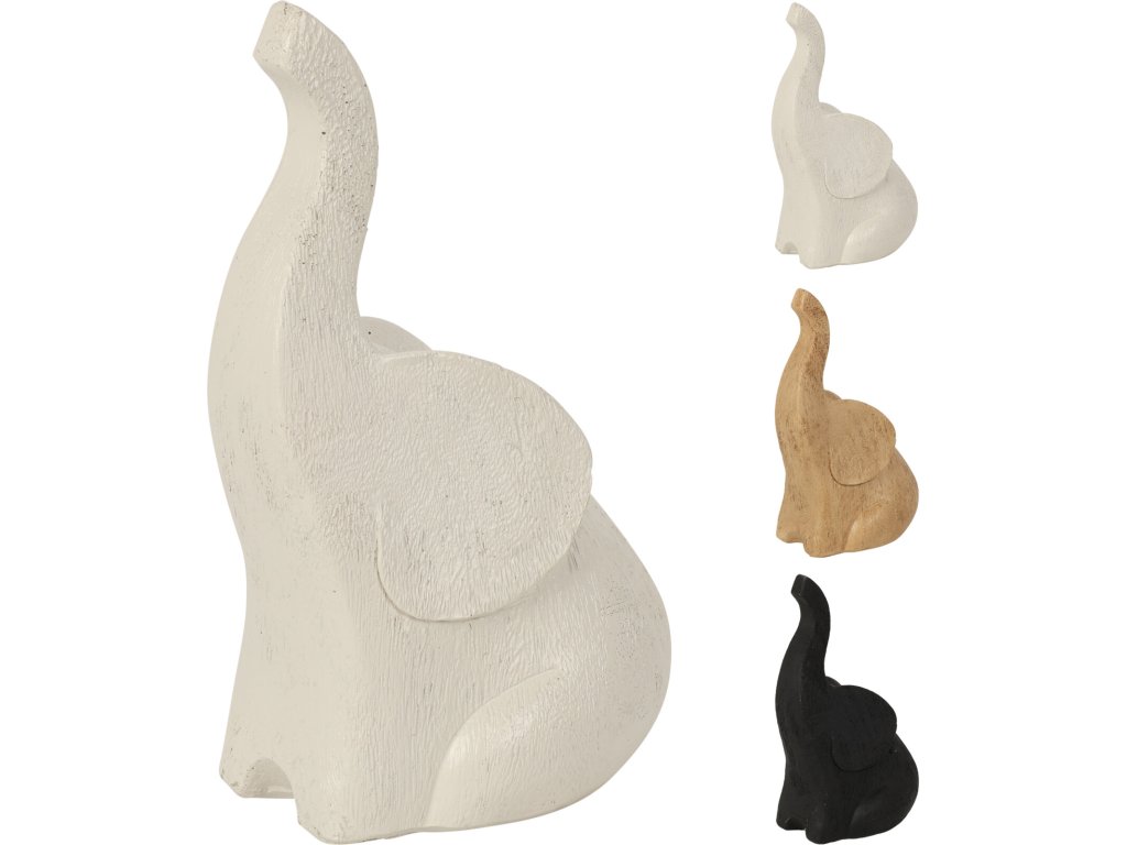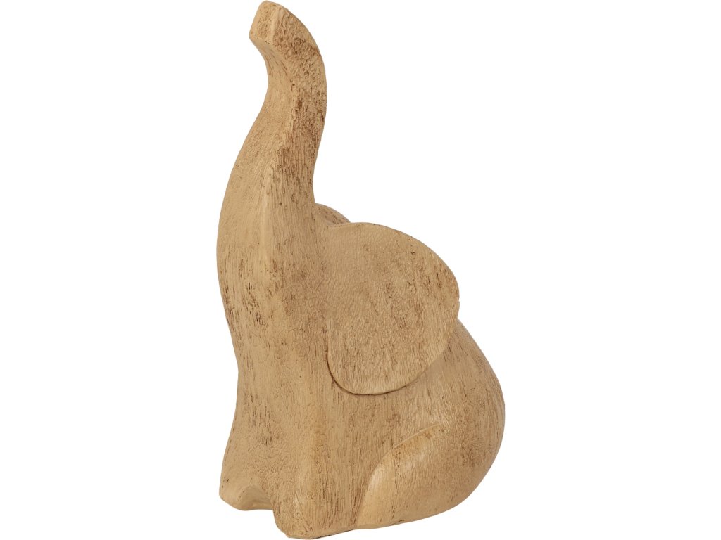 Materiál a design: Soška je vyrobena z kvalitního polyresinu, což zajišťuje trvanlivost a detailnost provedení. Její design zobrazuje slona v pozici s nataženým chobotem vzhůru, což je symbol štěstí a radosti.