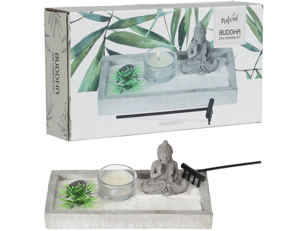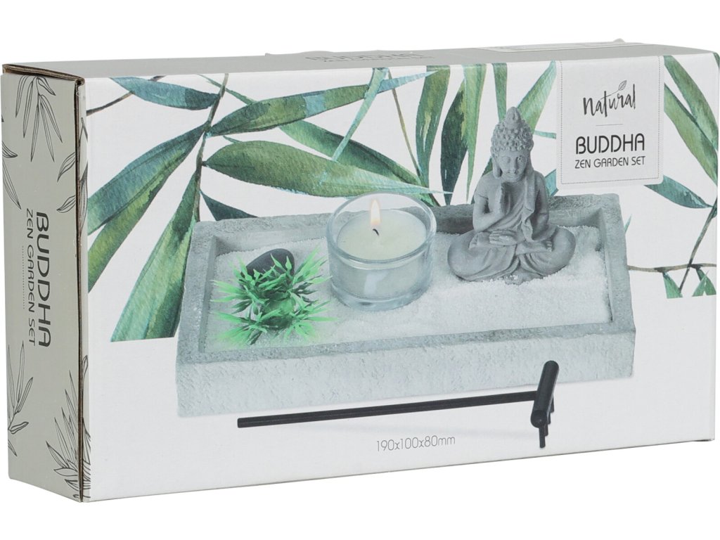 Zenová sada Buddha Lino je ideální dekorací pro vytvoření klidné a harmonické atmosféry ve vašem domově. Tato sada obsahuje vše potřebné pro vytvoření malého zenového zahradního koutku: cementový základ, cementového Buddhu, písek, kámen, čajovou svíčku, dekorativní rostlinu a hrábě.