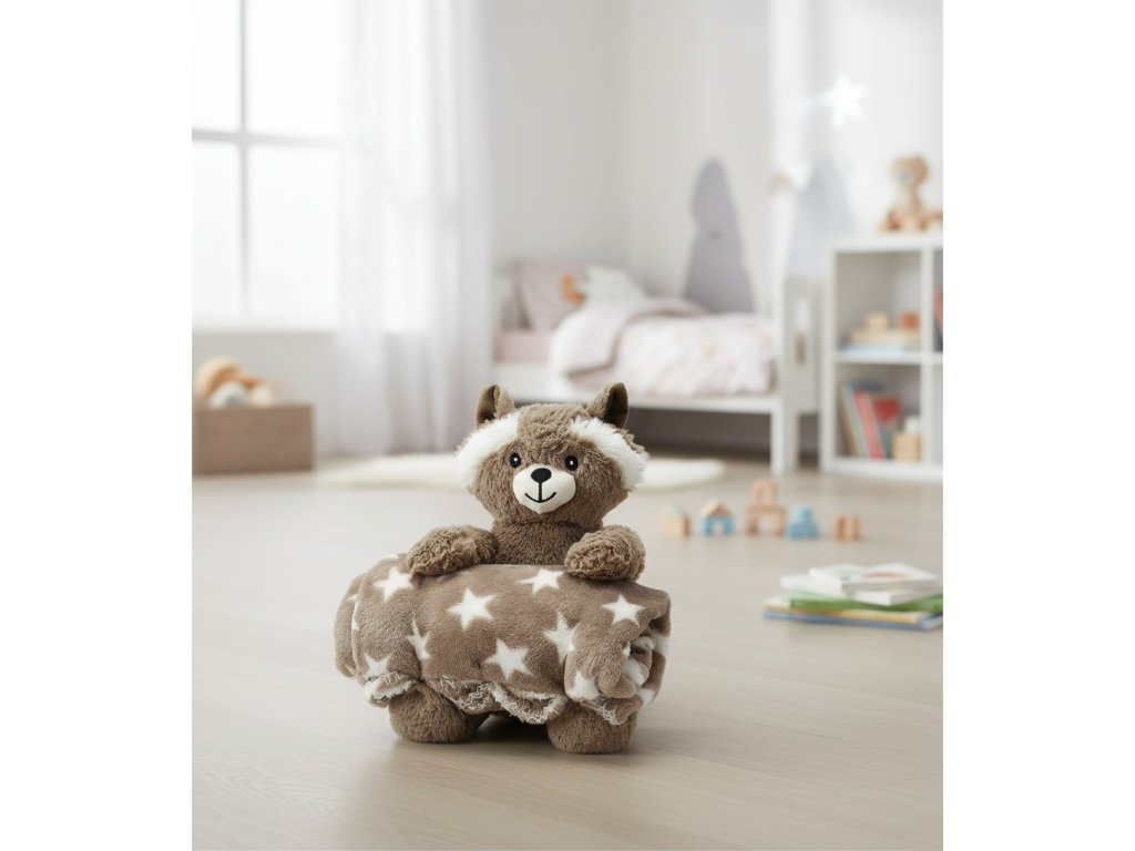 Plyšová hračka mývala s dekou s hvězdami, rozměr deky 75x100 cm. Materiál 100% polyester. Jemná na dotek, ideální pro mazlení a hru. Skvělý dárek pro děti.