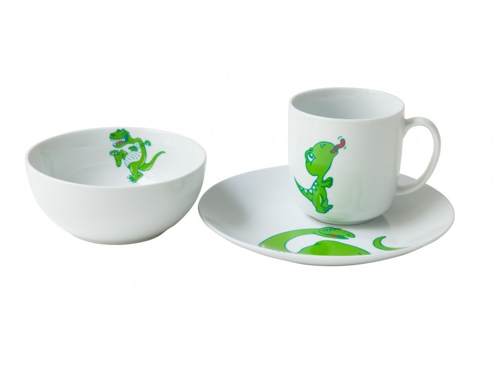 Porcelánový dětský / snídaňový set - miska, hrnek a dezertní talíř s dekorem Dino od české značky by inspire....porcelán s českou duší.