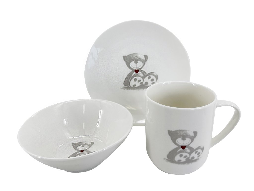 Dětská jídelní sada Teddy (talíř,miska,hrnek) – porcelánová sada s motivem medvídka, česká značka by inspire