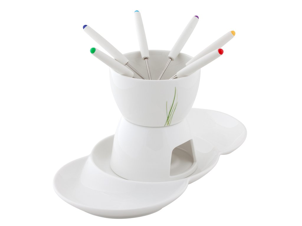 Porcelánové fondue obsahuje misku na rozehřívanou pochutinu. Čajová svíčka je schovaná pod stabilním podstavcem. Velký tác pro přípravu čokololády, ovoce nebo sýru. Napichovací vidličky 6 ks jsou barveně označeny, každý si pozná tu svou.