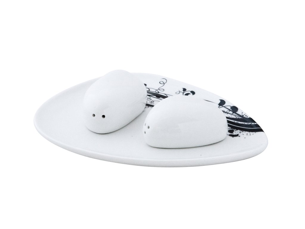 Porcelánová slánka a pepřenka na praktickém tácku s černým dekorem Black.