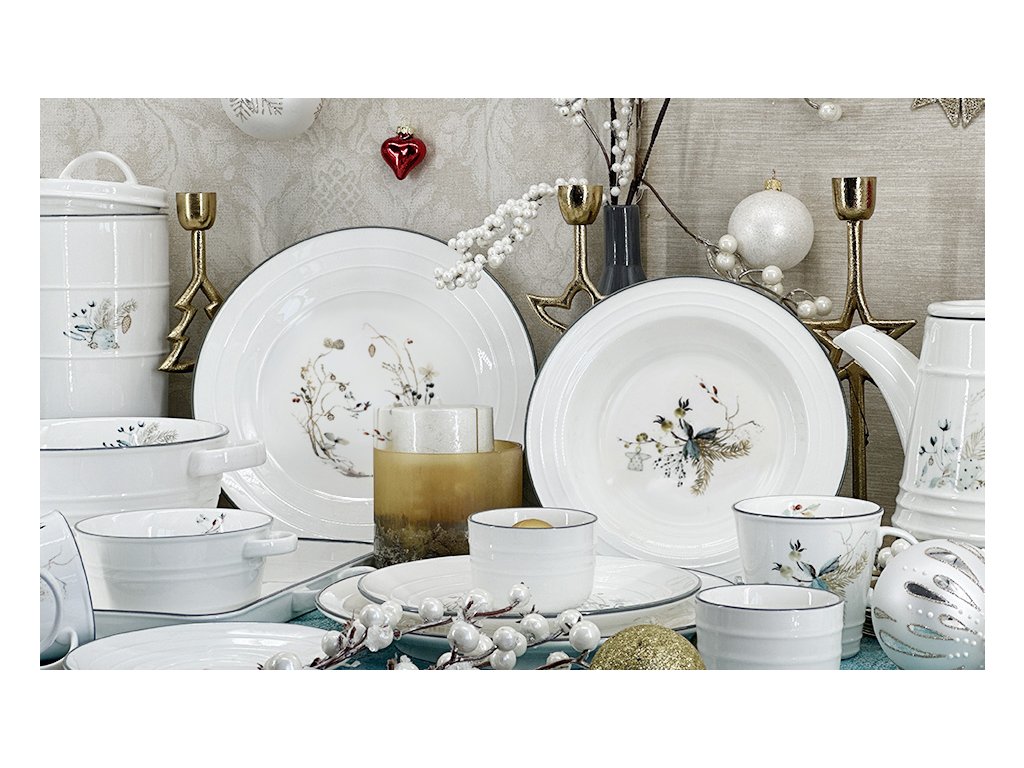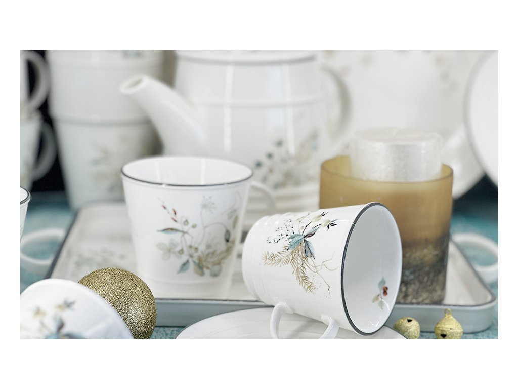 Vánoční dekor zobrazuje tradiční symboly Vánoc, jako jsou větvičky, šišky a ozdoby, v decentních odstínech zlaté, šedé a sněhové zelenomodré. Design připomíná klasické smaltované nádoby našich babiček, avšak s moderním nádechem.
