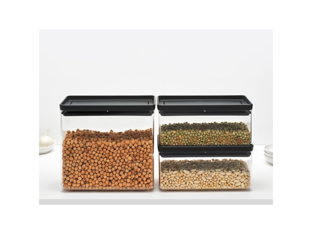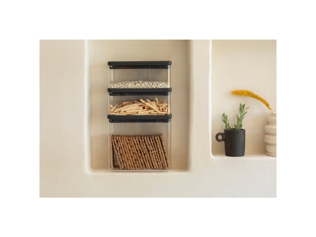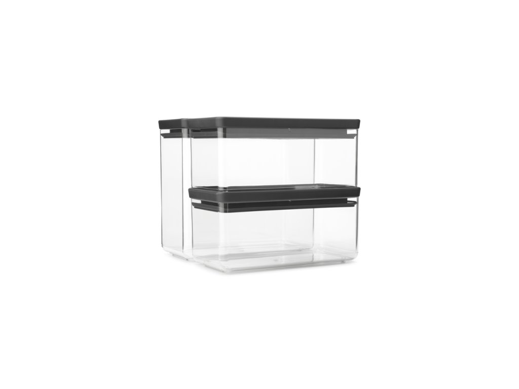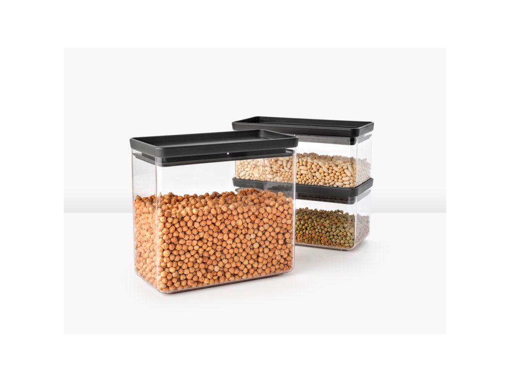 Dóza Square - sada 3 ks, Tasty+ stohovatelné dózy, objem 2x 1,5 L a 1x 3,5 L, materiál plast bez BPA, hranatý tvar, průhledné tělo, tmavě šedé víko.