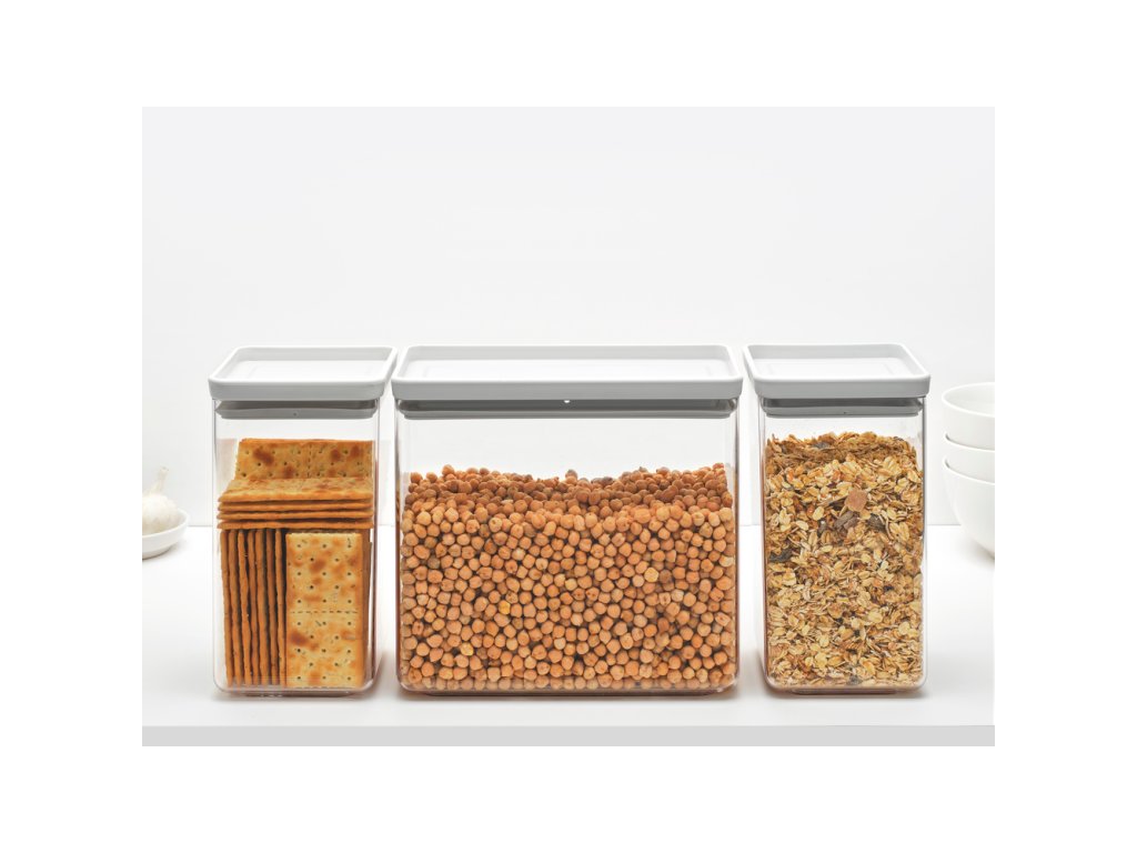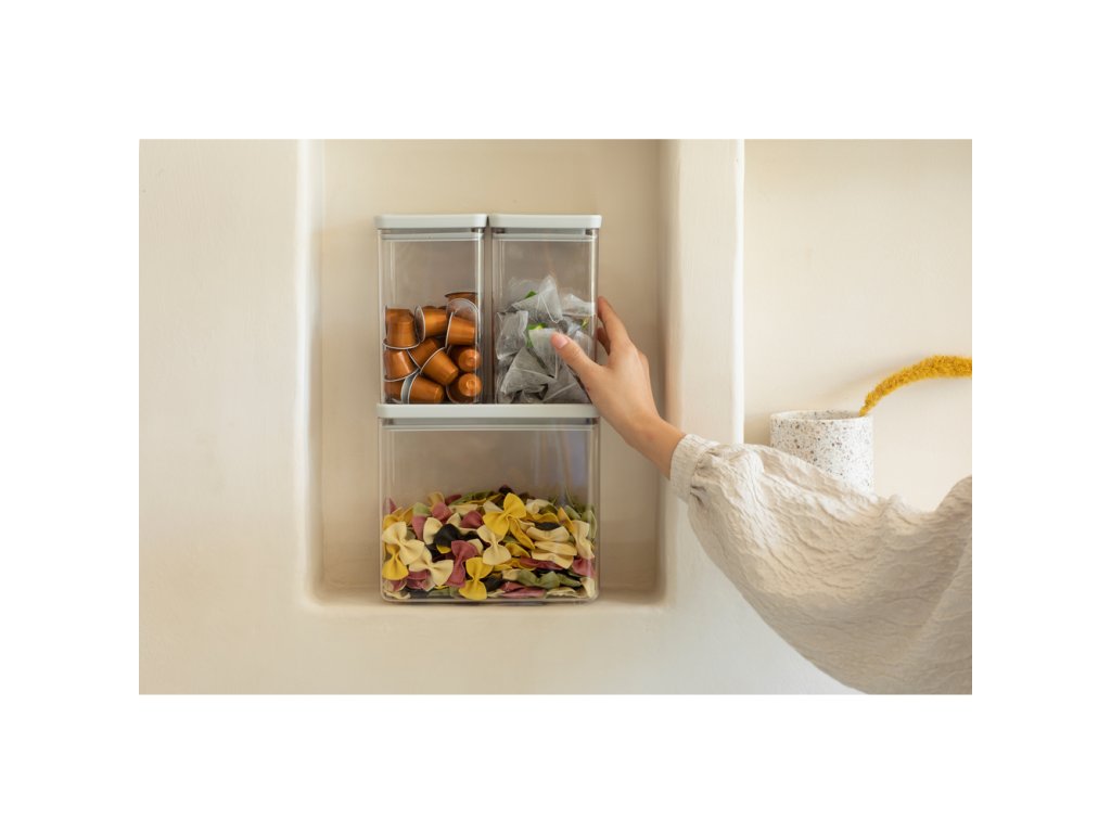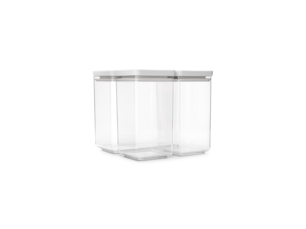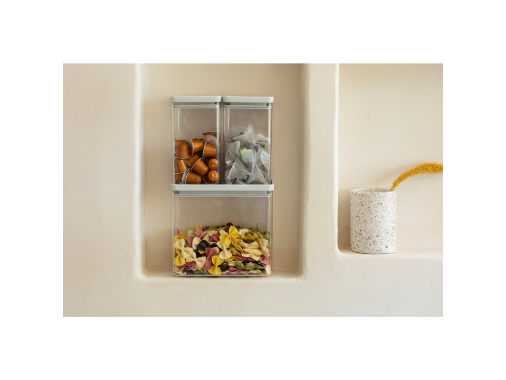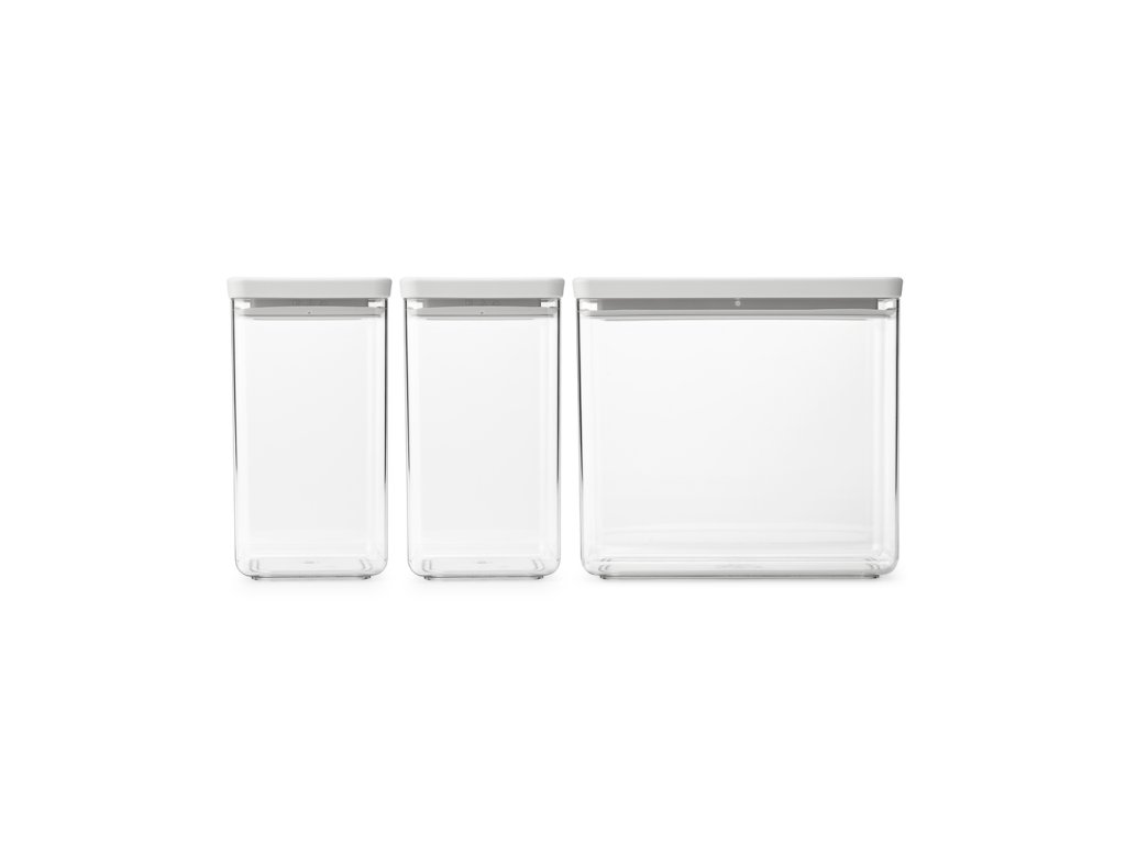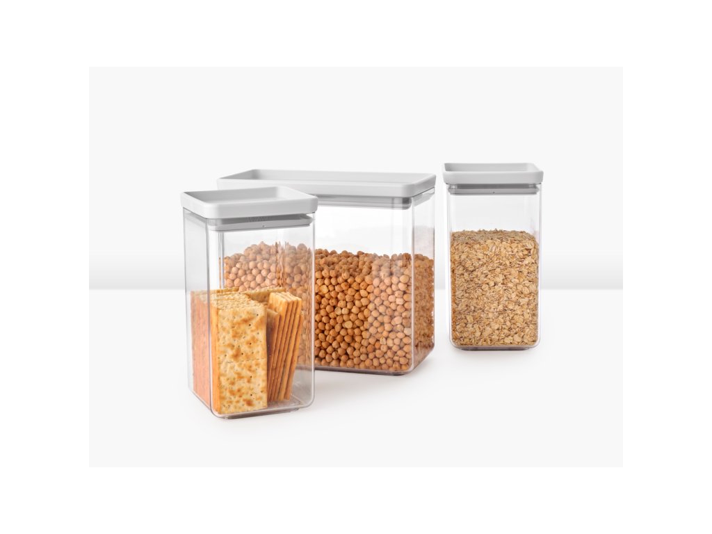 Dóza Square - sada 3 ks, Tasty+ stohovatelné dózy, objem 2x 1,6 L a 1x 3,5 L, materiál plast bez BPA, hranatý tvar, průhledné tělo, světle šedé víko.