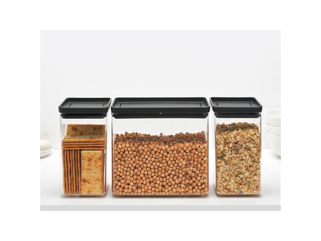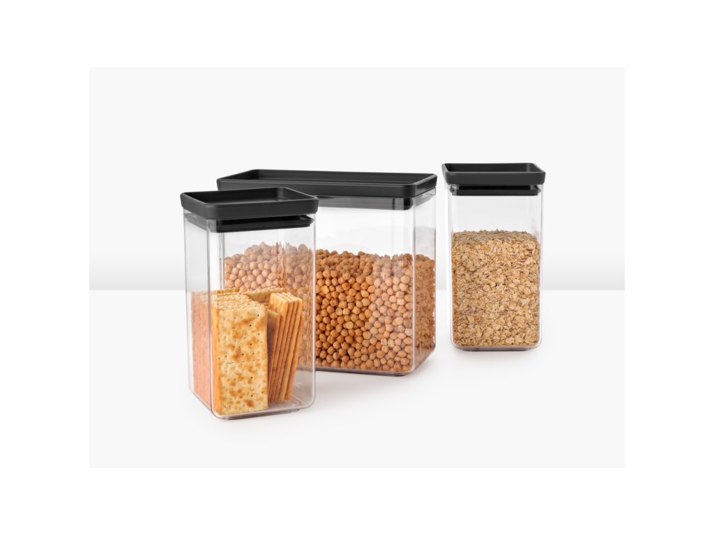 Dóza Square - sada 3 ks, Tasty+ stohovatelné dózy, objem 2x 1,6 L a 1x 3,5 L, materiál plast bez BPA, hranatý tvar, průhledné tělo, tmavě šedé víko.