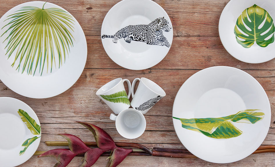 Porcelánové kulaté talíře a misky s divokým dekorem zelených listů v kombinaci s jaguárem jsou ideální pro letní zahradní párty a grilování.