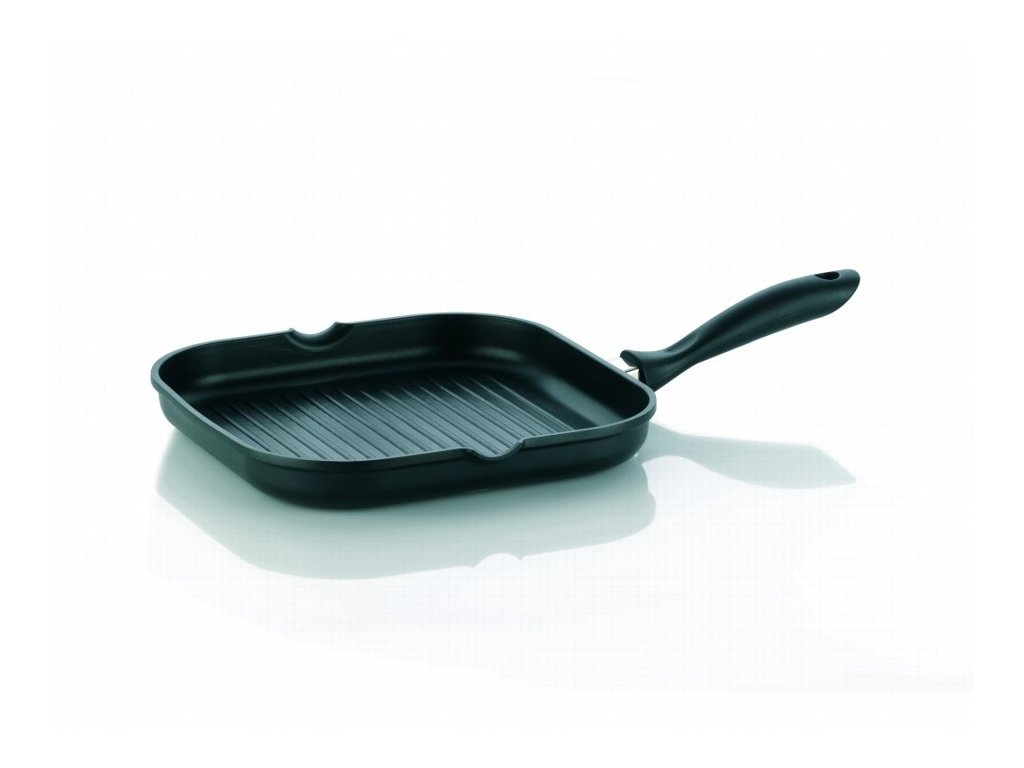 Grilovací pánev má čtvercový tvar a je vyrobena z tlakově litého hliníku. Tloušťka stěny je 5mm. Rukojeť je vyrabena z plastu.