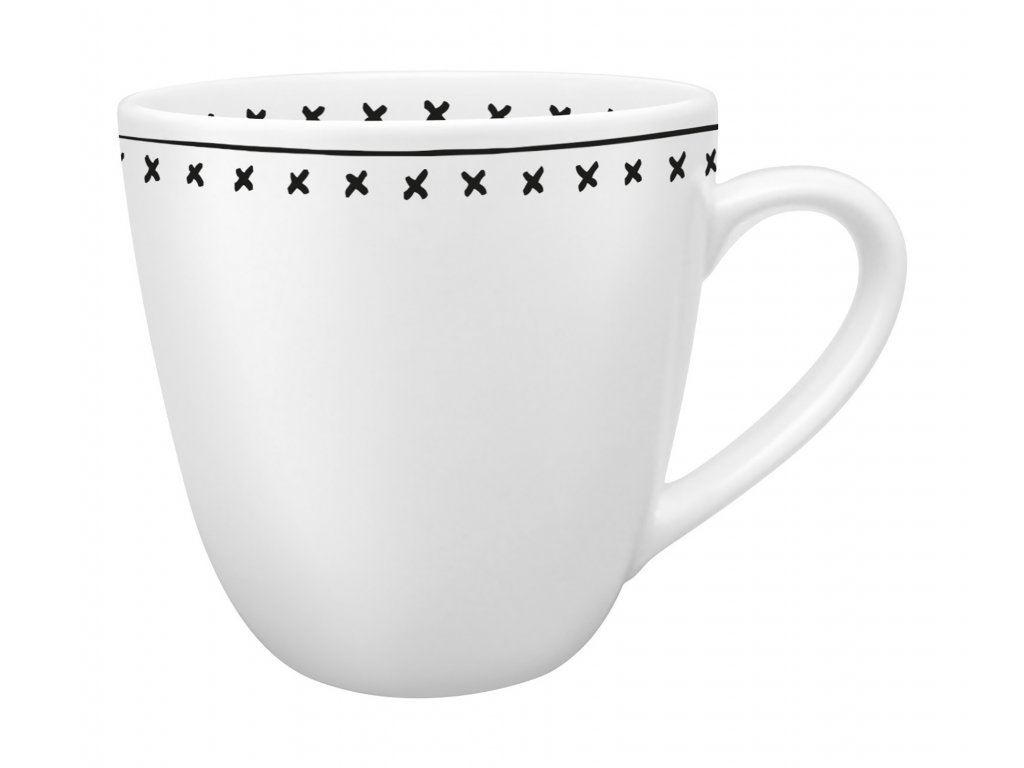 Porcelánový hrnek na čaj s jednoduchým černým dekorem. Okraj hrnečku je prošitý černou nití. Ozdobné černé stehy vytvářejí jednoduchý a originální dekor.