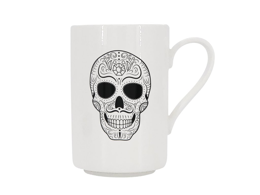 Hrnek je vyroben z kvalitního bílého porcelánu a zdobí jej propracovaná černobílá kresba cukrové lebky (Sugar Skull). Tento motiv symbolizuje oslavu života a památku zemřelých. Lebka je zdobená květinovými a ornamentálními prvky, které jí dodávají umělecký vzhled. Klíčovým a unikátním detailem je symbol diamantu, umístěný uprostřed čela, který představuje sílu, čistotu a nezdolnost. Hrnek Head Diamant je výrazný doplněk pro moderní kuchyni a skvělý dárek pro ty, kteří milují rockabilly styl nebo nekonvenční bytové doplňky.
