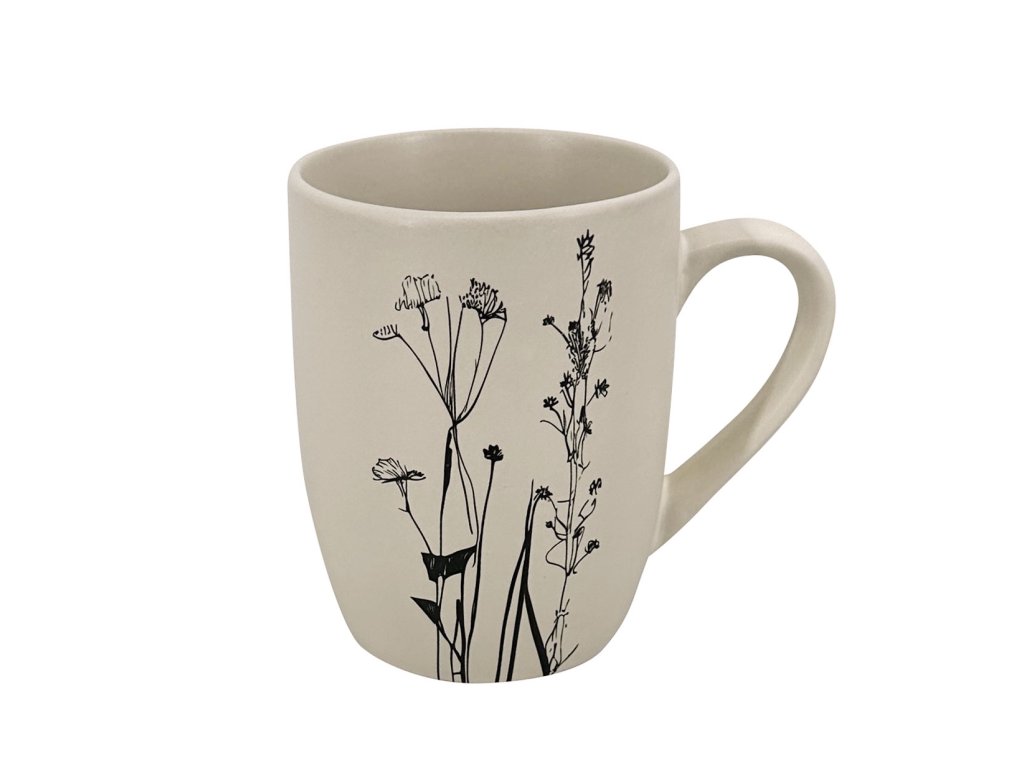 Hrnek Cream Garden přináší do vašich rukou jemnou krásu přírody. Smetanový keramický povrch zdobí decentní černý motiv lučních květin, který evokuje klid a romantiku rozkvetlé letní louky. Každý doušek z tohoto hrnku tak získává výjimečný nádech pohody a elegance.