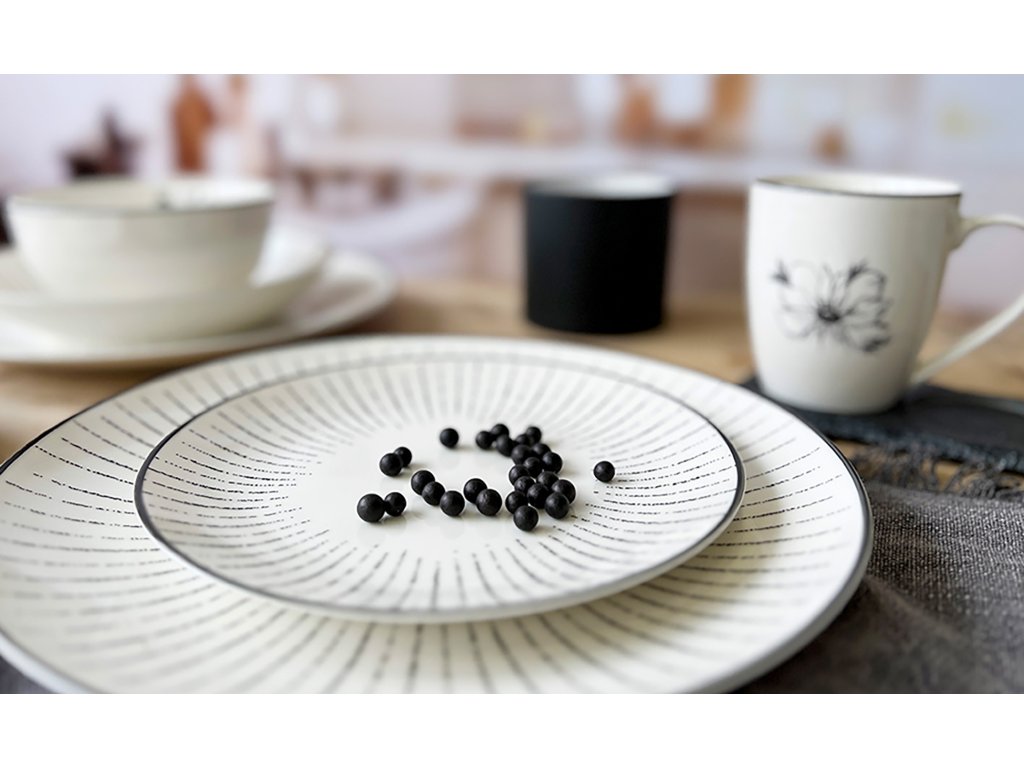 Tento kousek patří do rodiny naší vlastní české značky by inspire. Celý proces vzniku máme pod absolutní kontrolou: navrhneme dekor, aplikujeme jej na kvalitní porcelán a následně vše upečeme v naší peci. Díky tomuto poctivému postupu je černobílý motiv pevně zataven do glazury a odolá i náročnému používání. Moderní hrnek s paprsky tak můžete bez obav používat v mikrovlnné troubě i pravidelně mýt v myčce nádobí.