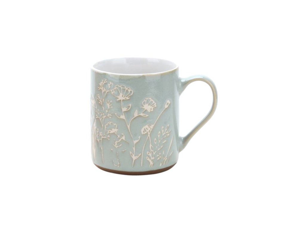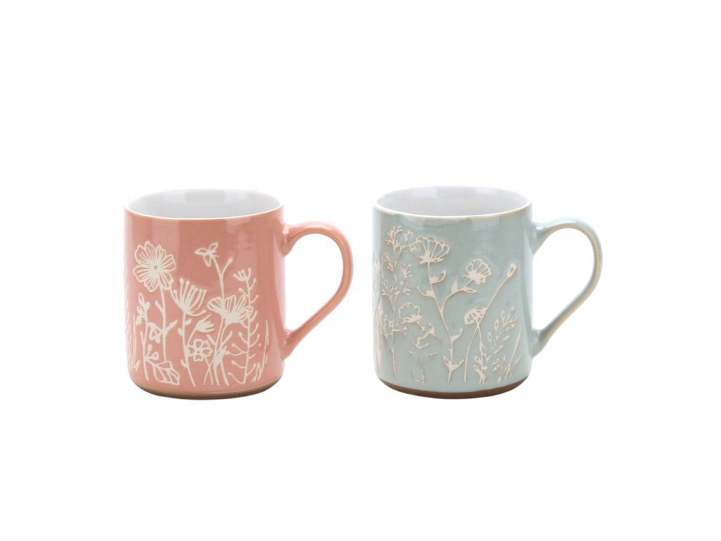 Velký keramický hrnek v tlumené růžové barvě a tlumené světle modré barvě s reliéfem lučního kvítí. Pořádný hrnek na čaj nebo jiný oblíbený nápoj. Díky většímu oušku se hrnek dobře drží a padne do ruky. Hrnek je zdobený motivem květin v bílé barvě.