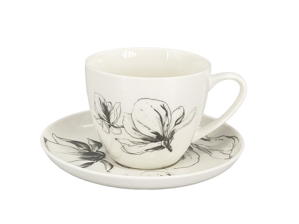 Šálek s podšálkem na kávu Fine Twig, bílá s dekorem magnolie v šedožluté barevné kombinaci.