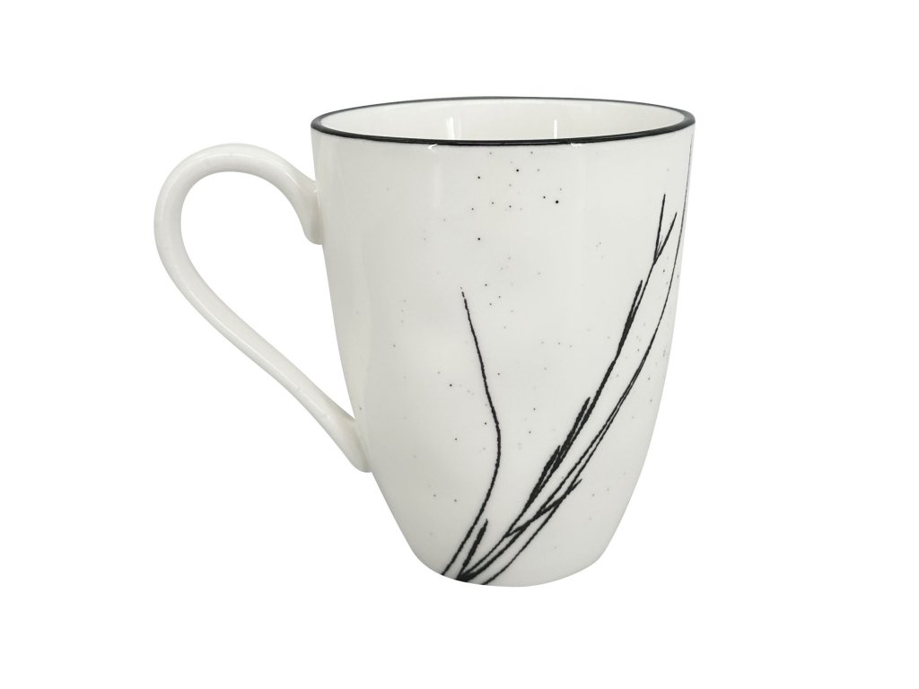 Hrnek Bird s velkorysým objemem 450 ml je vyroben z bílého porcelánu s jemným kropenatým detailem, který mu propůjčuje ručně vyráběný charakter a přírodní vzhled. Elegantní hrnek je na okraji zakončen černou linkou a hlavním dekorem je stylizovaný kolibřík a na druhé straně motiv černé trávy. Kolibřík symbolizuje radost a lehkost, což dělá z hrnku skvělého společníka pro každý den.