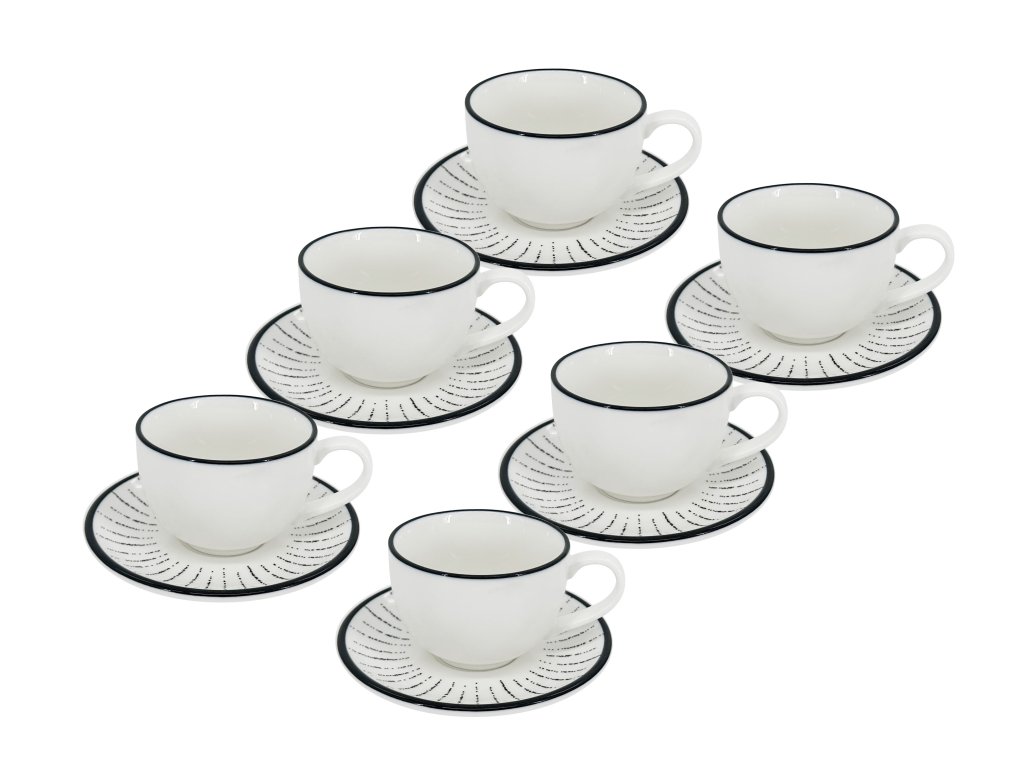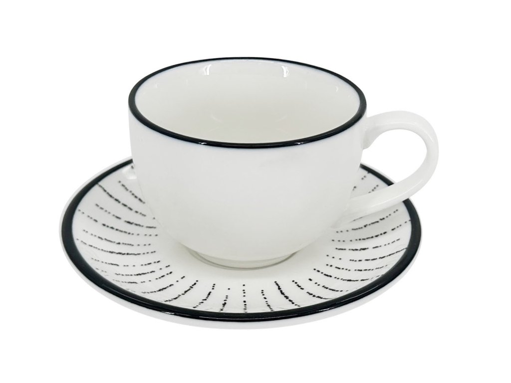Dodejte svému stolování moderní rytmus. Set 6 ks cappuccino šálků Alba Dash o objemu 200 ml představuje originální pojetí minimalismu. Zatímco šálky si zachovávají čistou eleganci bílého porcelánu zdobeného pouze tenkou černou linkou na okraji, podšálky jsou oživeny dynamickým motivem černých paprsků (dash). Tato kombinace vytváří na stole zajímavý vizuální efekt, který je pro kolekci