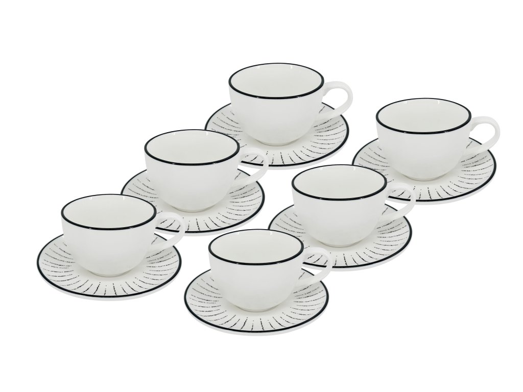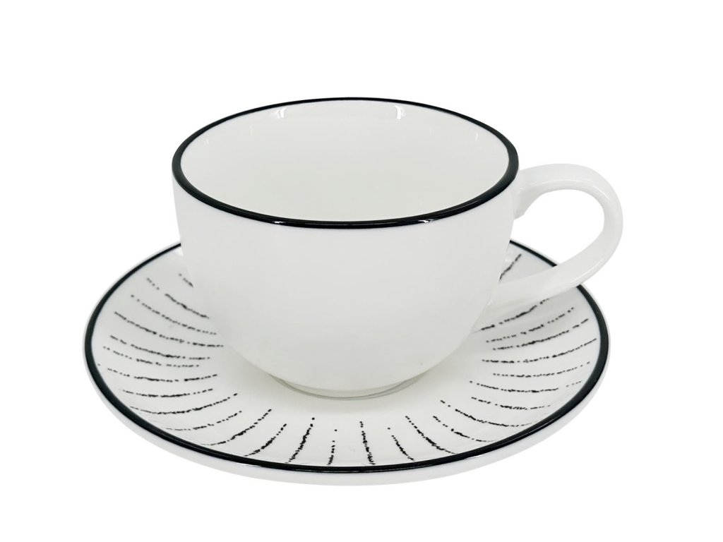 Proměňte své espresso v moderní vizuální zážitek. Set 6 ks presso šálků s podšálky Alba Dash o objemu 90 ml představuje originální pojetí kávového minimalismu. Zatímco samotné šálky si zachovávají čistou eleganci bílého porcelánu zdobeného pouze tenkou černou linkou na okraji, podšálky jsou oživeny dynamickým motivem černých paprsků (dash). Tato kombinace vytváří na stole zajímavý kontrast, který je pro kolekci