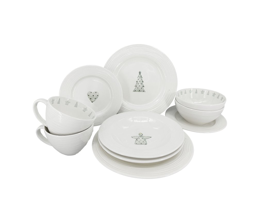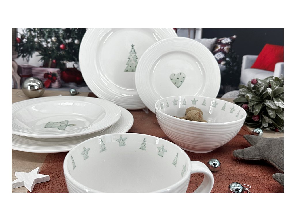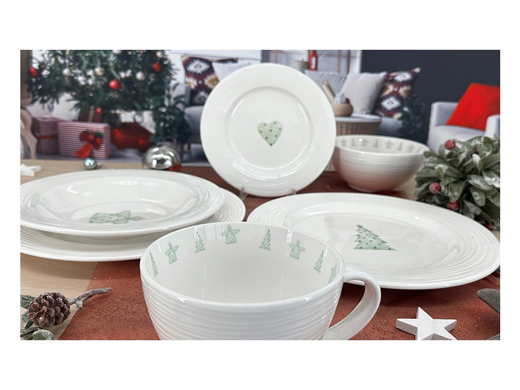 Každý kus této vánoční porcelánové sady je zdoben jemnými embosovanými detaily a slavnostním dekorem andělů, stromečků a srdcí. Talíře mají elegantně embosované okraje a zdobení uprostřed, zatímco misky a hrnky mají embosovanou vnější stranu a vánoční dekoraci umístěnou na vnitřní horní stěně. Tato jídelní sada s vánočním dekorem je harmonickým doplňkem vaší sváteční tabule.