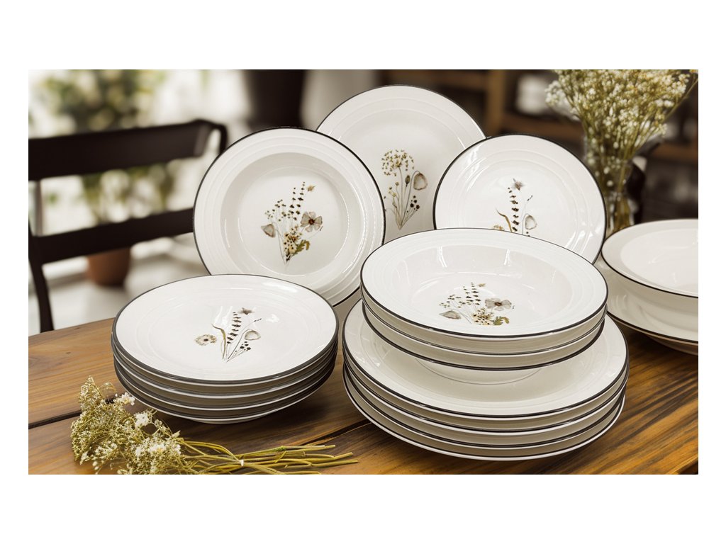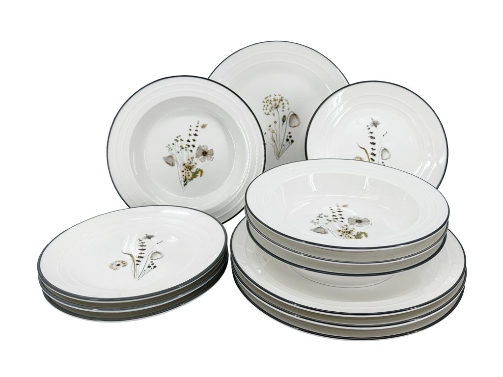 Jídelní sada Nostalgie Meadow spojuje eleganci porcelánu s vintage stylem inspirovaným smaltovaným nádobím. Jemný přírodní dekor lučních květin v neutrálních tónech dodává stolování harmonii a nadčasovost. Šedý lem podtrhuje retro vzhled a dodává autenticitě.