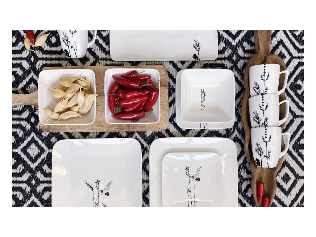 Kolekce Carré Field přináší moderní hranaté talíře. Porcelánové hranaté talíře se smetanovým nádechem mají zaoblené rohy, které celou kolekci zjemňují a dodávají ji na eleganci. Originální design dotváří jednoduchý černý motiv klasů a polní trávy. Žně a sklizně vždy představovaly hojnost. Hojnost chceme mít i na svých stolech a vychutnat si dobré jídlo. Svým netradičním tvarem přinášejí do jídelny nový rozměr a zajímavost.