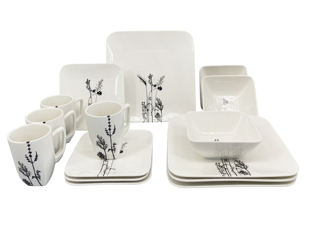 Jídelní souprava hranatých talířů a hrnků Carré Field, 16 ks, bílá s černým dekorem.