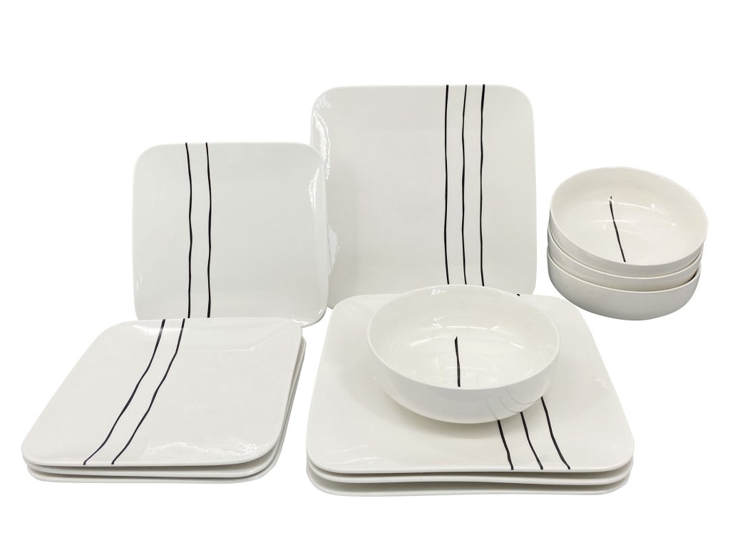 Jídelní souprava hranatých talířů Carré Grafico, 12 ks, bílá s černým dekorem.