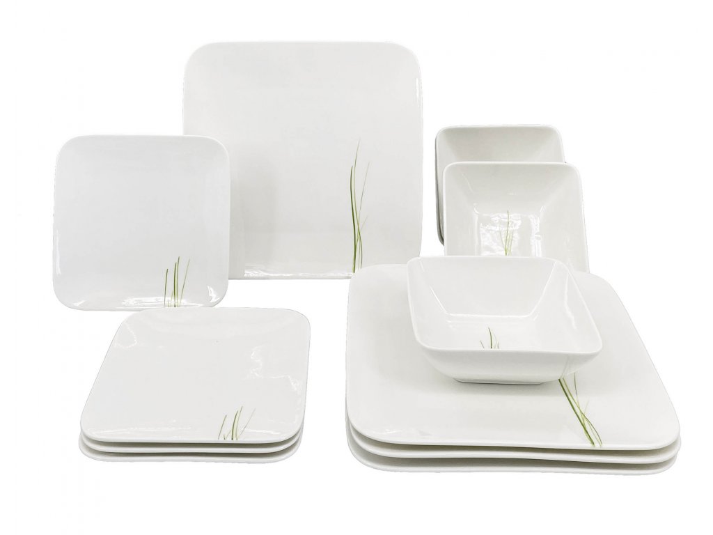Jídelní souprava čtvercových talířů Carré Grass, 12 ks, bílá se zeleným dekorem.