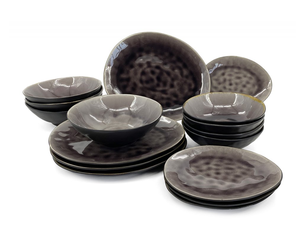 Keramická jídelní souprava 16 ks Deep se stříkanou glazurou v odstínech fialové barvy.