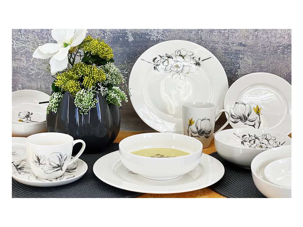 Jídelní porcelánová sada talířů, 18 ks, bílá s dekorem magnolie v šedožluté barevné kombinaci.
