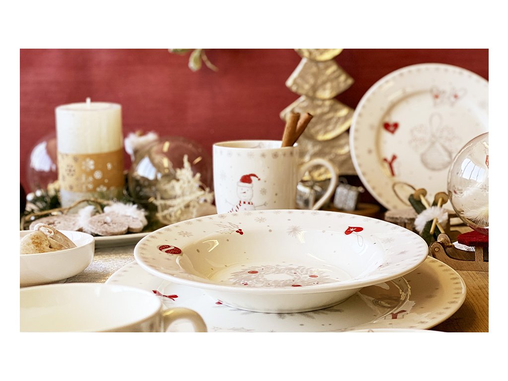 Kulaté bílé talíře jsou základem této kolekce. Jsou k dispozici ve třech velikostech - mělké, dezertní a polévkové talíře, takže budete mít veškeré potřebné nádobí pro své vánoční hosty. Talíře jsou zdobeny vánočním dekorem v šedé a červené barvě, který přináší nádhernou vánoční atmosféru na váš stůl.
