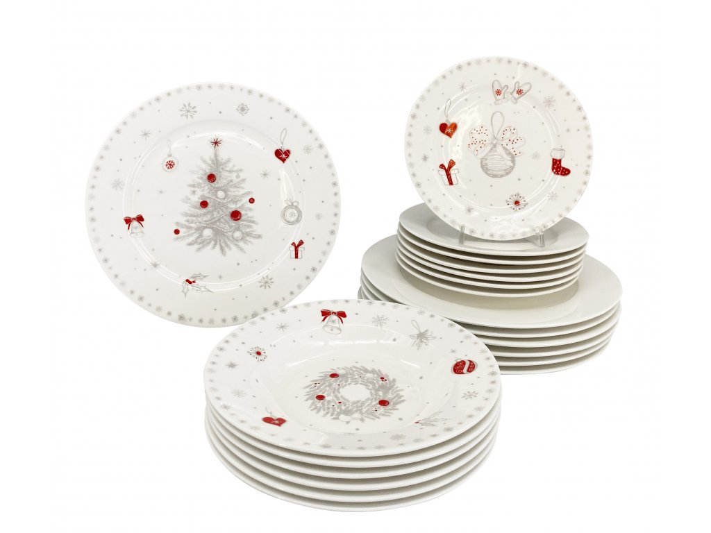 Jídelní porcelánová sada talířů, 18 ks, bílá s vánočním dekorem.