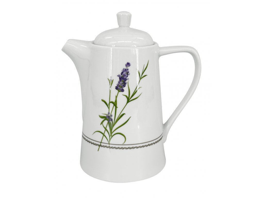 Konvice s jemným zdobeným pruhem v barvě taupe v kombinaci s dekorem levandule. Levandule je již klasikou a stále funguje. Není se čemu divit, při pohledu na levanduli se okamžitě přenesete do Středomoří, připomene se vám atmosféra francouzského pobřeží a vybaví nekonečná pole zahalená do fialové barvy a překrásné vůně.