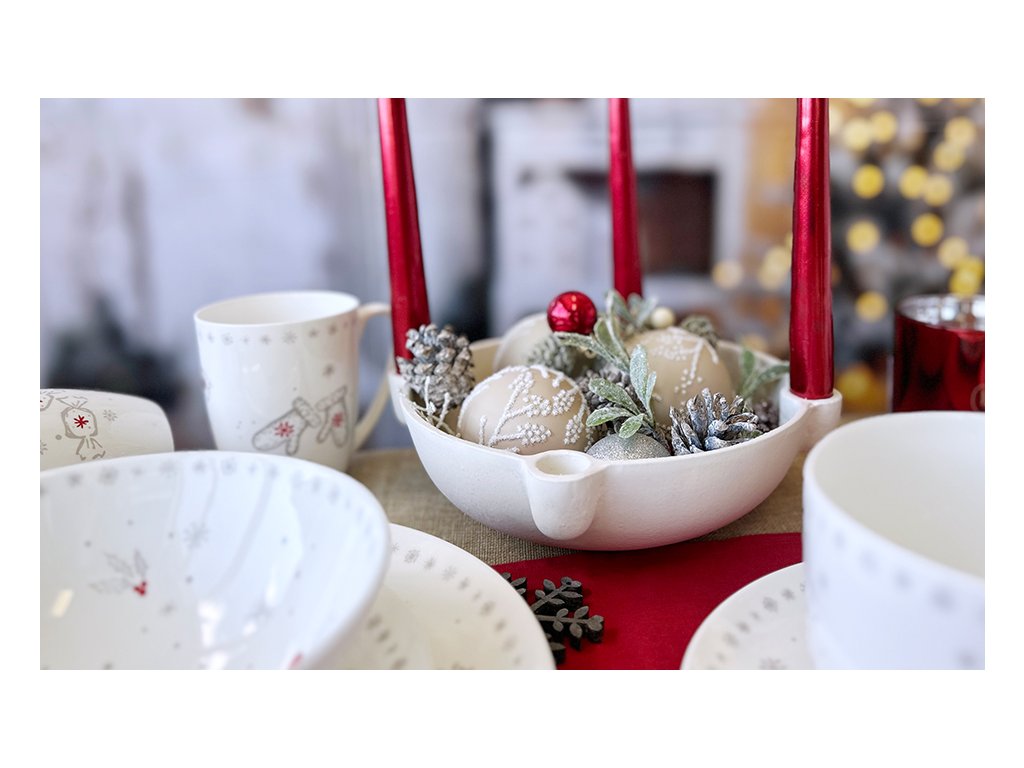 Konvice Luna Koleda má elegantní, kulatý tvar a je vyrobena z prvotřídního bílého porcelánu. Dekor je decentní a nadčasový: centrální motiv tvoří stylizovaný vánoční stromek v šedých a stříbrných tónech, doplněný červenými vánočními baňkami. Naše česká značka by inspire klade důraz na originalitu. Navrhneme dekor s důrazem na sezónní symboliku, aplikujeme na porcelán a vše upečeme v naší peci. Díky tomu je tento vánoční motiv trvale chráněn a odolný.