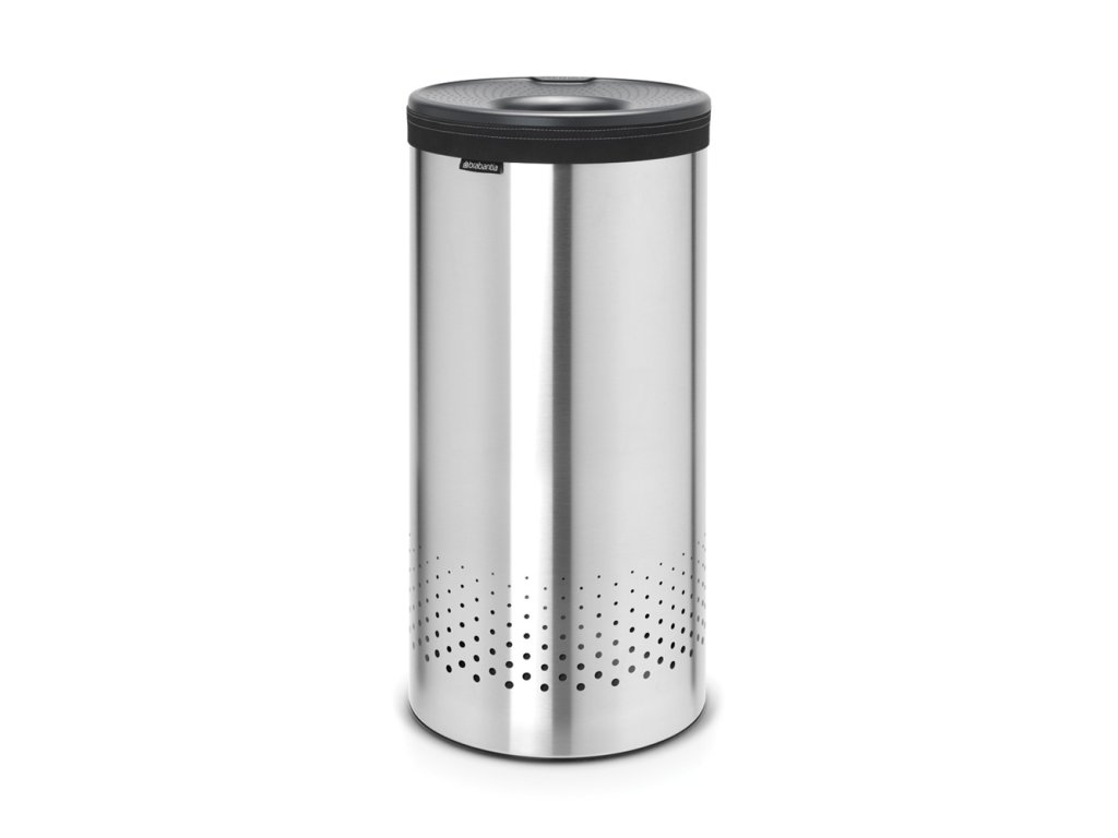 Koš na prádlo v matné oceli s plastovým šedým víkem a kapacitou 35 L.