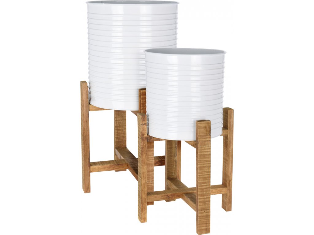 Kovový květináč v bílé barvě s dřevěným podstavcem.