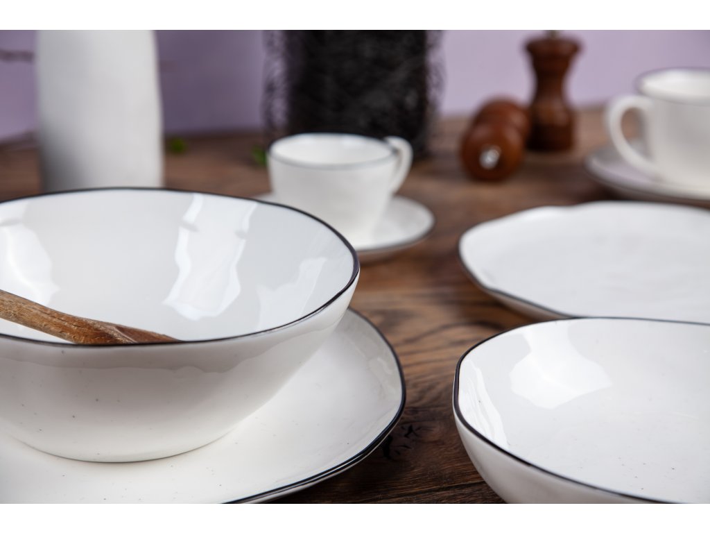 Z této porcelánové kolekce Legenda Vám bude jistě chutnat. Česká značka by inspire…porcelán s českou duší přináší tak trochu jinou jídelní kolekci. Kvalitní kostní porcelán má nepravidelný tvar, jemně kropenatý povrh a černé lemovaní. Tento rádoby starý vzhled podtrhne vaši domácí kuchyni. Vytvořte si svou jedinečnou sadu talířů – mixujte s kolekcí Esence.
