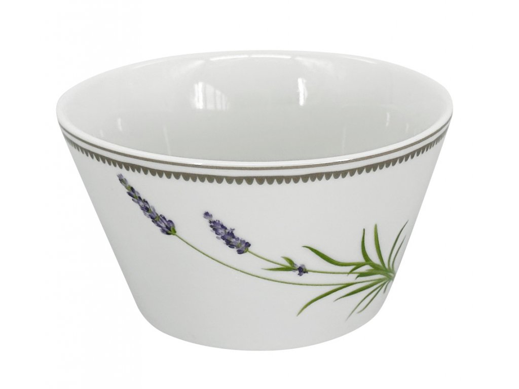 Miska na müsli s jemným zdobeným pruhem v barvě taupe v kombinaci s dekorem levandule. Levandule je již klasikou a stále funguje. Není se čemu divit, při pohledu na levanduli se okamžitě přenesete do Středomoří, připomene se vám atmosféra francouzského pobřeží a vybaví nekonečná pole zahalená do fialové barvy a překrásné vůně.