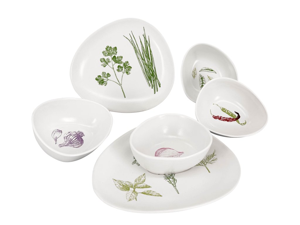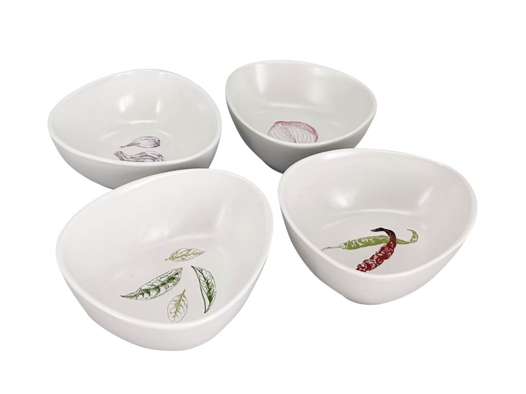 Servírovací set Stone Spice zahrnuje 4 misky o rozměru 13 x 11,5 x 5 cm, vyrobené z keramiky. Keramické servírovací misky jsou zdobené barevným dekorem zeleniny, a bylinek, jako je bazalka, chilli papriky, cibule a česnek.