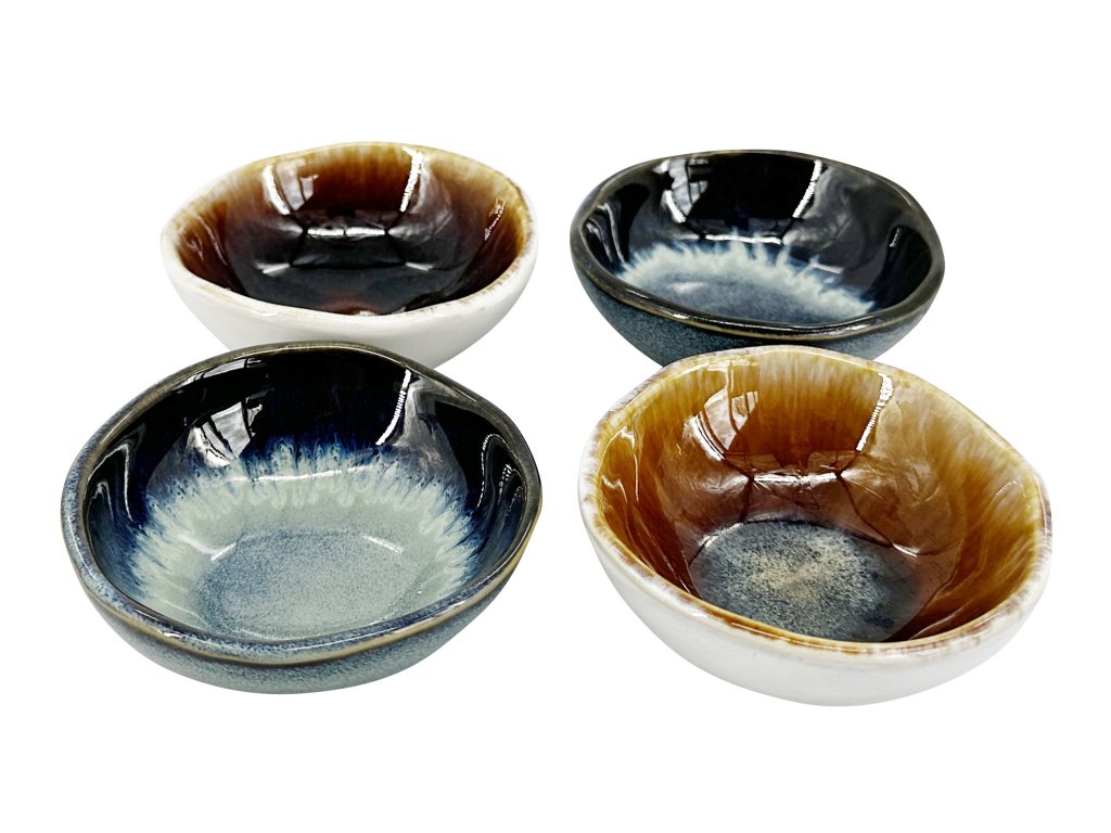 Tyto barevné misky s průměrem 8,5 cm jsou mistrovským dílem, kde každá z nich vyniká svou jedinečnou, ručně glazovanou úpravou, která vytváří efekt fascinujících přechodů a "vln" barev. Různé odstíny, od zemitých tónů až po uklidňující modrou, se elegantně prolínají, což činí každou misku skutečným originálem.
