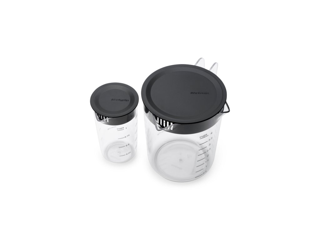 Obě odměrky jsou vybaveny výlevkou a štěrbinovým víkem, které umožňuje přesné nalévání i filtrování bez nepořádku. Ergonomický design zajistí pohodlné držení a snadné nalévání. Vyrobeno z vysoce kvalitního plastu, který je bezpečný pro potraviny, odolný a 100% recyklovatelný.