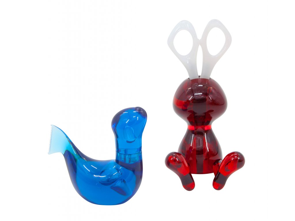 Roztomilý lachtan - držák na pásku v modré barvě z tvrzeného akryliku. Stojan na nůžky ve tvaru králíka z tvrzeného akryliku v červené barvě a dětské zaoblené nůžky.